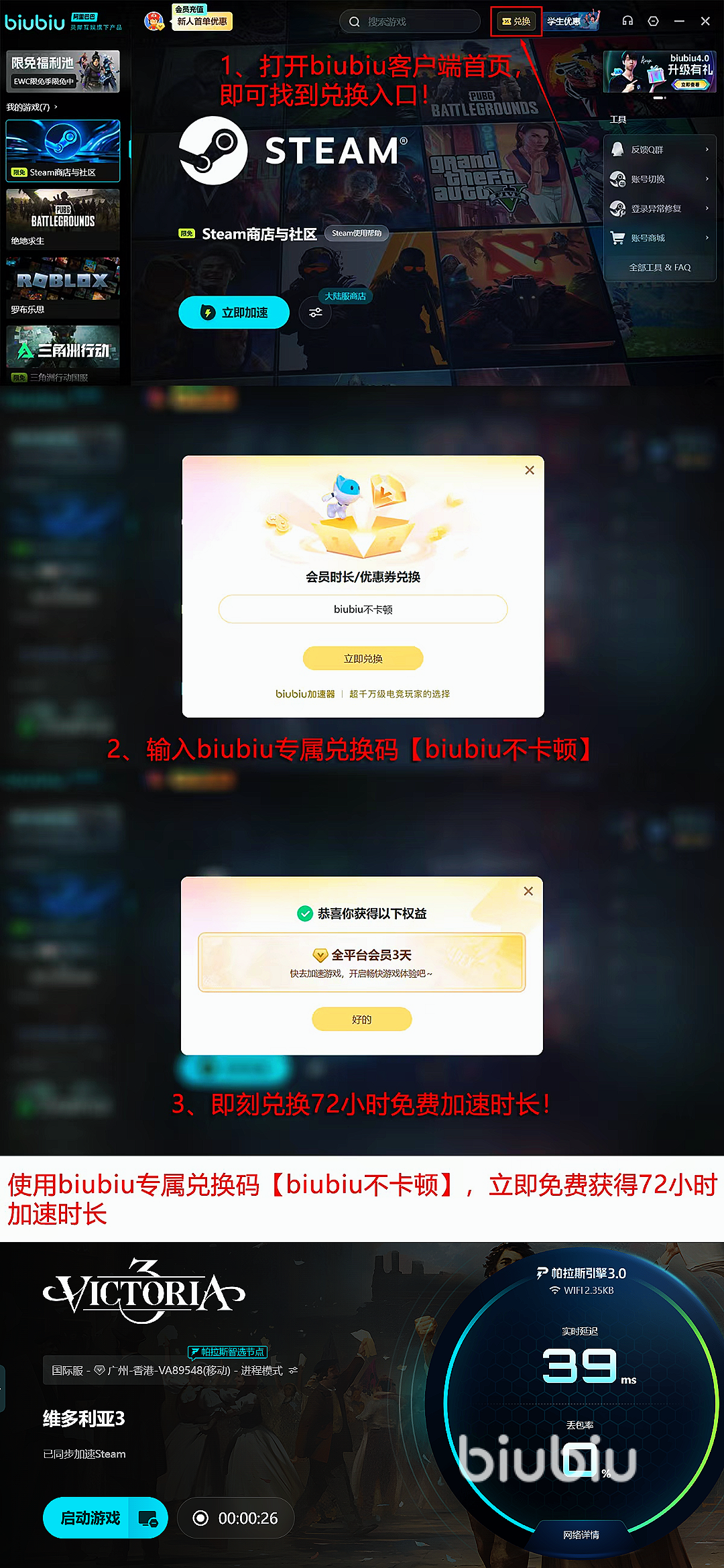 同时为了回馈广大玩家,平台推出重磅福利:新用户注册即享24小时全游戏免费加速,热门手游端游通通支持;所有用户输入兑换码【biubiu不卡顿】,还能再多领3天免费加速时长,稳定加速不花钱,轻松提升游戏对战体验。
