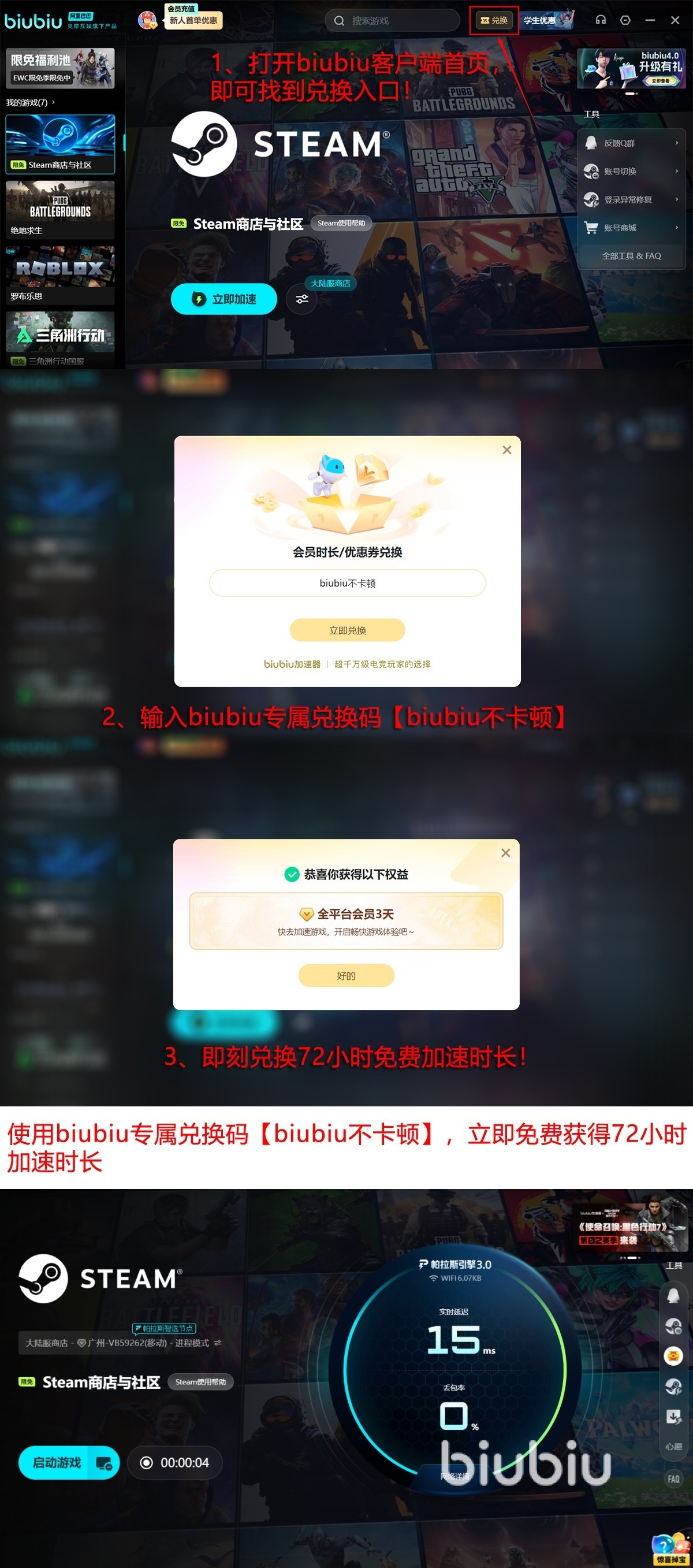 新用户现在享受多重体验权益。首先是新账号的登录,自动收取系统赠送的24小时全功能免费加速时长。在平台兑换页面输入专属码【biubiu不卡顿】,还能够额外领取72小时加速权益,这项兑换福利新老用户都能够领取一次。更值得一提的是,目前软件对steam开放了限免活动,实打实的优惠给到了大家。