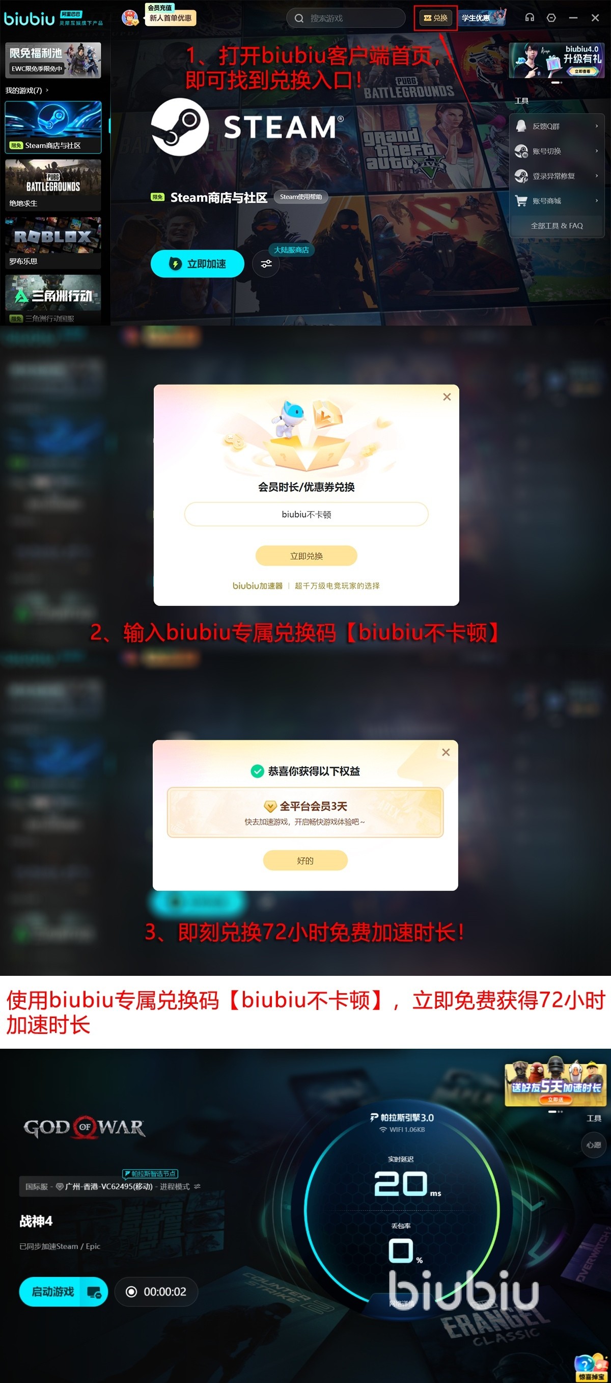 对于想尝试一下的玩家来说,biubiu现在有不错的福利活动,首次注册的用户可以获取24小时免费加速时间。在兑换页面输入口令【biubiu不卡顿】,每位用户都可以兑换得三天的加速权益。新人在两项福利叠加之后,最高可享96小时无限制加速体验,足够你在北欧世界安心闯荡,体感受它带来的丝滑手感。
