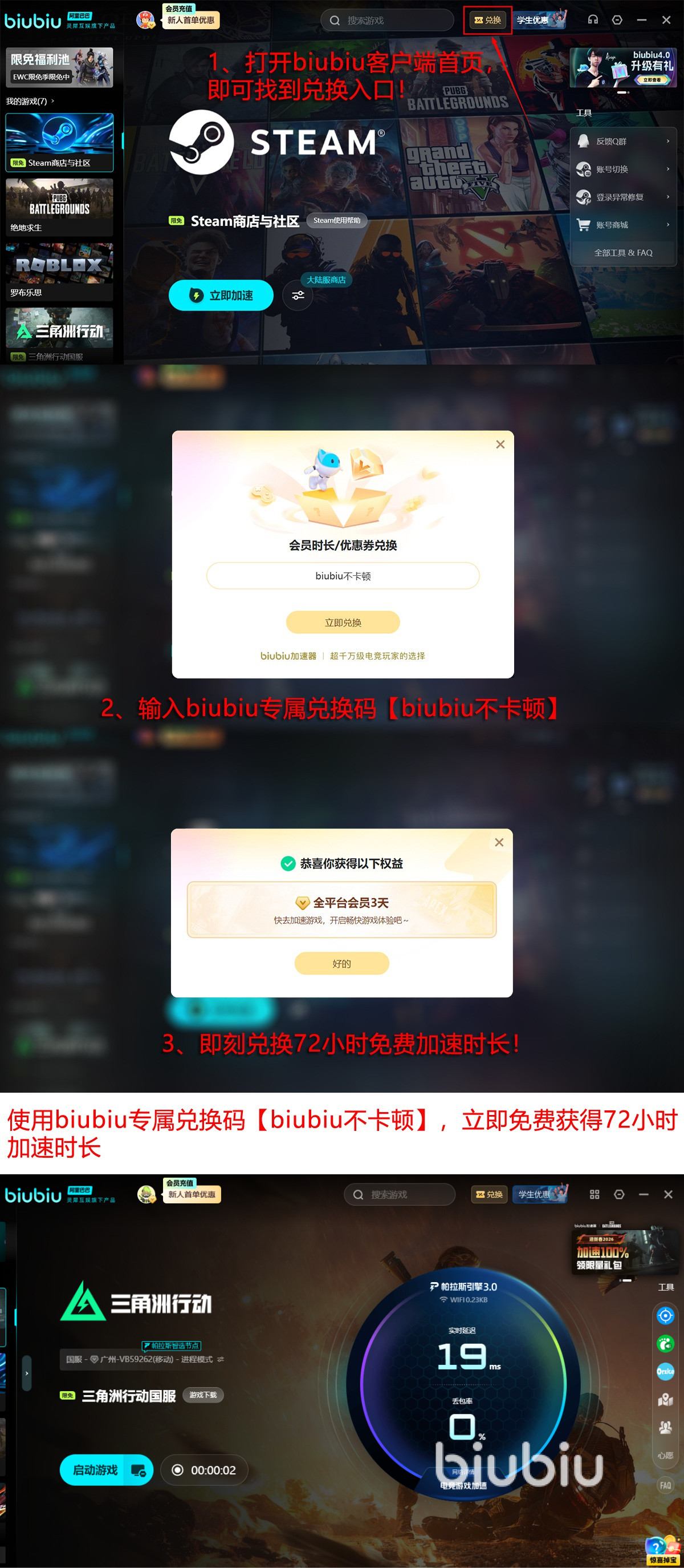 有的玩家想先看看能不能成功进入三角洲的地图里,这时可通过新人福利——注册领取24H的免费加速,先搞定一下当前的窘况。之后就会发现一切都解决好了,还想继续加速的话。新老用户可输入兑换码【biubiu不卡顿】,就能获取三天免费加速,新人总共就是96H的免费加速啦!