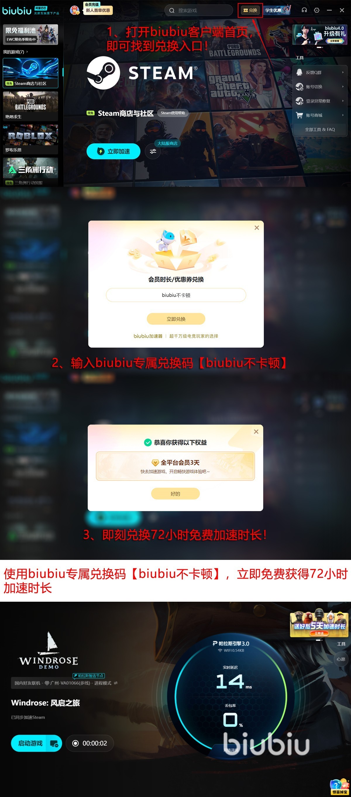 现在零成本来试用,新人登录直接送24H服务时长,输入【biubiu不卡顿】专属码再拿72H全功能体验权益,当然,兑换福利是新老用户均可领取的。