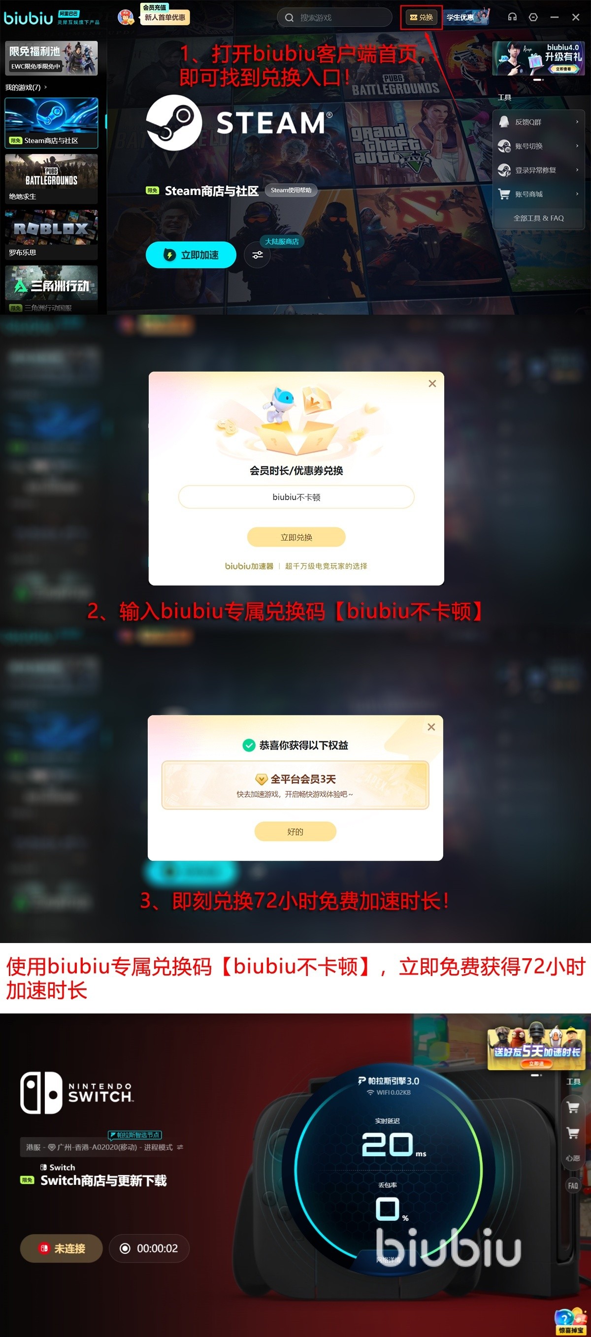 很多朋友未曾接触过加速应用,担心不会用。其实不需要顾虑过多,biubiu上手难度非常低,基本就是零门槛,点击就能用。新老用户们用兑换码【biubiu不卡顿】就可以换取三天的全功能体验时间,亲自感受用法与性能。如果你是新用户的话,还有官方赠送的24小时免费加速时间,两项叠加起之后就有总计96个小时超长体验。