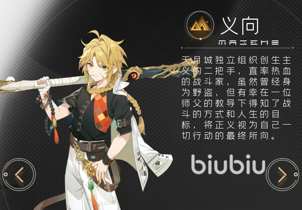 义向:天月城创生主义成员,土属性近战输出角色。技能链设计强调连贯性与节奏把控,具备多段突进、浮空衔接及终结斩击等动作要素,单体爆发强度突出。但因身板较脆且需贴近目标作战,实战中依赖队友保护与控制掩护,适合在己方拥有稳定控场或减伤配置时投入使用。