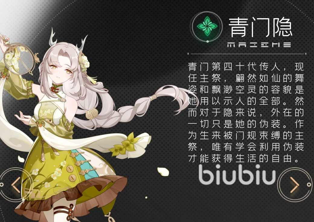 青门隐:木系辅助型角色,擅长团队控场与持续支援。技能组合涵盖群体减速、负面状态驱散及队友生命恢复,在战斗中常部署于后排,通过稳定增益保障前排输出环境与续航能力。