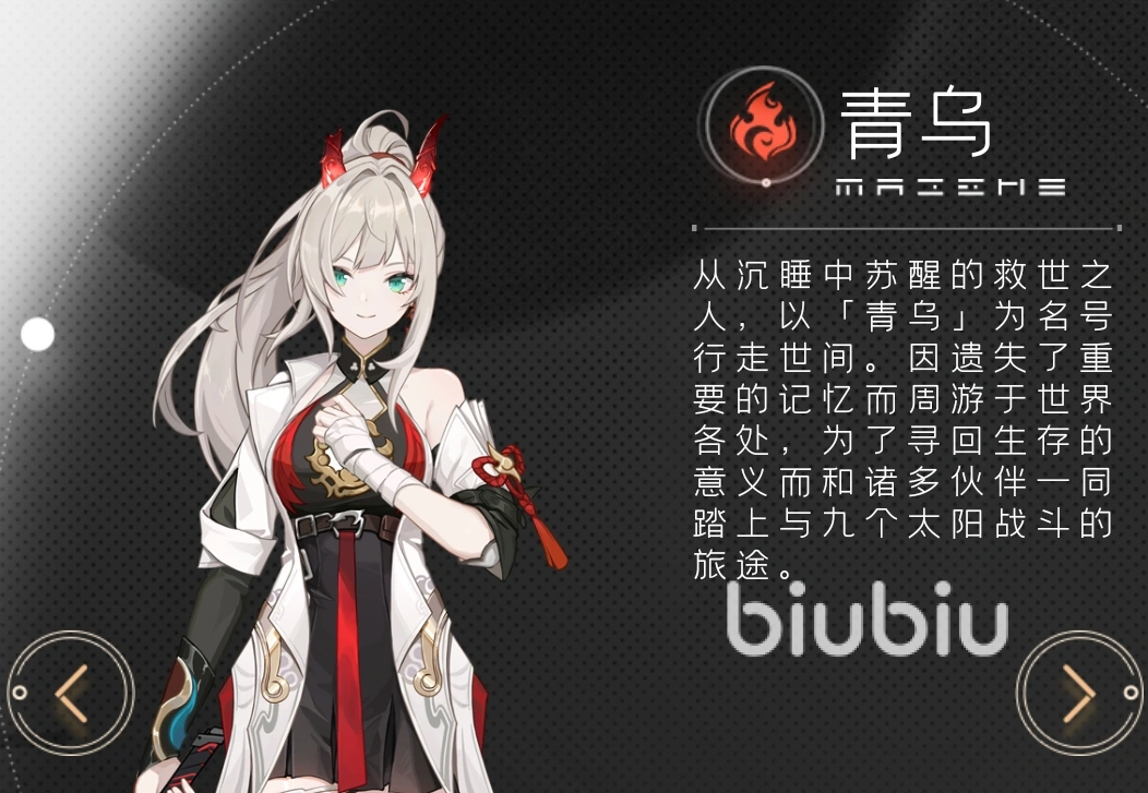 青鸟:隶属月能管理局外勤队,火属性输出角色。特技“闪射回旋”兼具位移与范围灼烧效果,可叠加燃烧层数;当灼烧层数累计至三层时,可触发终极技能“天光如灼”,释放大范围高倍率火属性爆发伤害,并附带短暂禁疗效果。