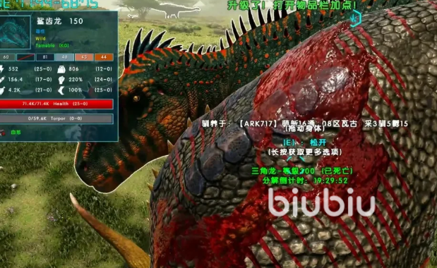 拖行尸体逐步接近鲨齿龙,当距离缩短至其感知半径(约25米)内时,它会自主上前吞食。此时界面将显示驯服进度条,标志着初始信任已建立。进度增长速率受服务器倍率直接影响:高倍率环境下可能仅需1–2次投喂即可大幅推进;而在官方服务器或默认单机设置下,通常需重复投喂3–5次才能达成初步友好状态。进度满格后,鲨齿龙周身浮现绿色光效,表示进入限时友好期,持续时间为10分钟,期间必须完成全部驯服步骤。