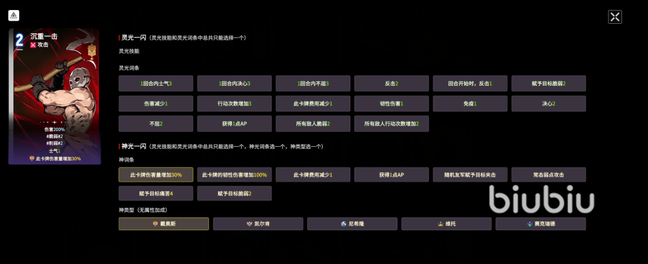 第三张为【沉重一击】。该卡不仅提供200%基础伤害,更附带“目标获得2点脆弱+2点虚弱”双重减益,大幅削弱敌方防御与输出能力,间接放大流血收益。适用于戴奥斯与尼希隆等依赖持续施压的角色。最优词条配置为“获得1点AP”与“卡伤害量增加30%”,前者保障回合内多次出牌可能,后者直接提升单次流血触发阈值,增强整体伤害密度。