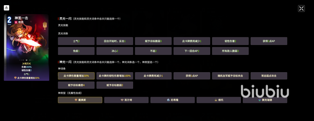 第二张关键卡牌为【神圣一击】。在角色处于“消灭”状态时,该卡基础伤害提升至200%,并稳定触发高额流血效果。其词条组合强调生存与爆发兼顾:“卡牌的韧性增加100%”提升抗打断能力,“此卡费用减少1”加快节奏,“赋予目标痛苦4”则进一步扩大持续伤害总量,形成多层流血叠加结构。