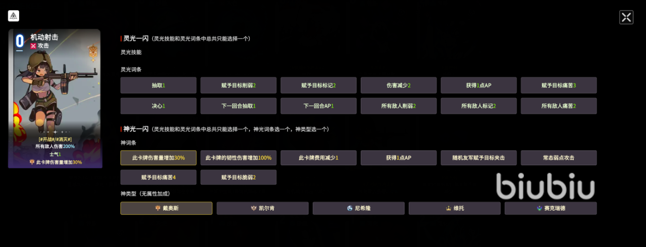 最后一张高泛用性卡牌为【机动射击】。该卡无前置条件,登场即用,基础伤害达200%,具备极强的即时流血响应能力。推荐灵光词条为“下一回合抽1”(维持手牌厚度)与“所有敌人削弱2”(扩大群体压制面);神词条则优先选择“此卡伤害量增加30%”与“此卡韧性伤害增加100%”,双维度强化其作为主力输出卡的稳定性与终结能力。
