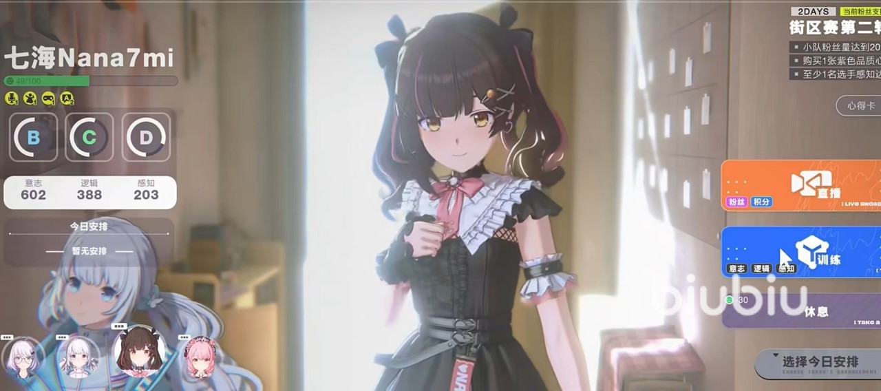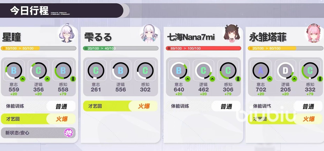 关于行程系统,玩家需每日为偶像规划三项核心日程:直播、训练与休息。直播可同步获取粉丝量与积分,其中粉丝量对应战斗中的总生命值,积分则用于兑换心得卡;训练聚焦于提升角色左侧面板显示的意志、逻辑、感知三项属性;休息则用于降低压力值,防止因过度安排导致状态衰减。三类行为存在资源冲突机制——同一时段叠加直播与训练虽可行,但将显著推高压力值,需谨慎权衡。