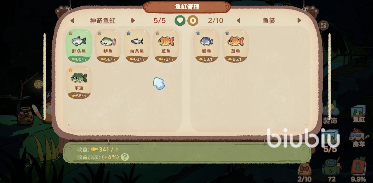 游戏采用极简交互设计,全程无需复杂操作。系统内置智能助手“小鱼菲舍”,自动完成抛竿、收线、识别鱼种、判断咬钩时机等核心流程,让玩家专注沉浸于垂钓节奏本身。所获鱼类可自由选择出售换取金币,或投入鱼缸持续产出鱼币;后者可用于升级钓具(鱼竿、鱼线、鱼饵)、拓展鱼缸容量、装饰鱼台与鱼篓,以及解锁全新鱼种图鉴。