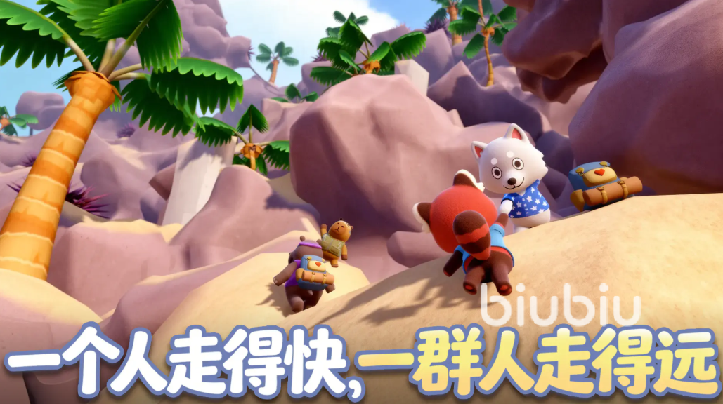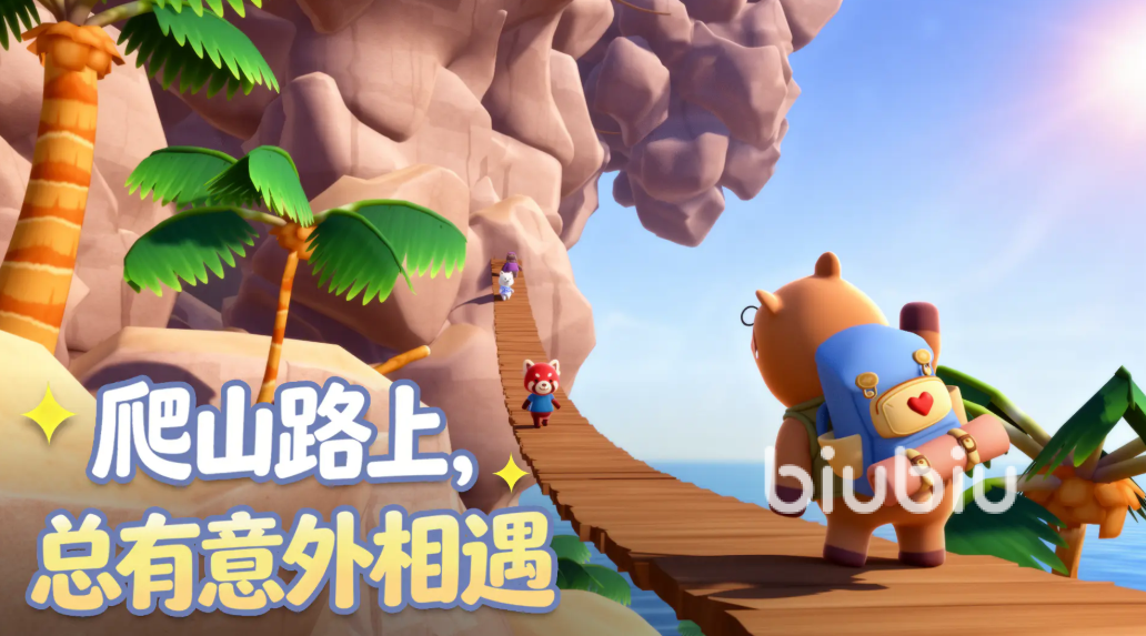 游戏以物理驱动的多人协作为核心设计语言。玩家操控拟人化小动物角色,在岩壁、雨林、雪峰等多变地形中完成动态攀爬。所有交互均基于真实感物理反馈:例如需主动伸手拉拽队友跨越断崖;在垂直落差较大的区域,可由一名玩家蹲伏为支撑点,另一名玩家踩踏其肩部跃升至高台。该机制强调实时沟通与动作预判,支持自由匹配或通过房间码组建固定队伍,协作效率直接决定登顶成败。