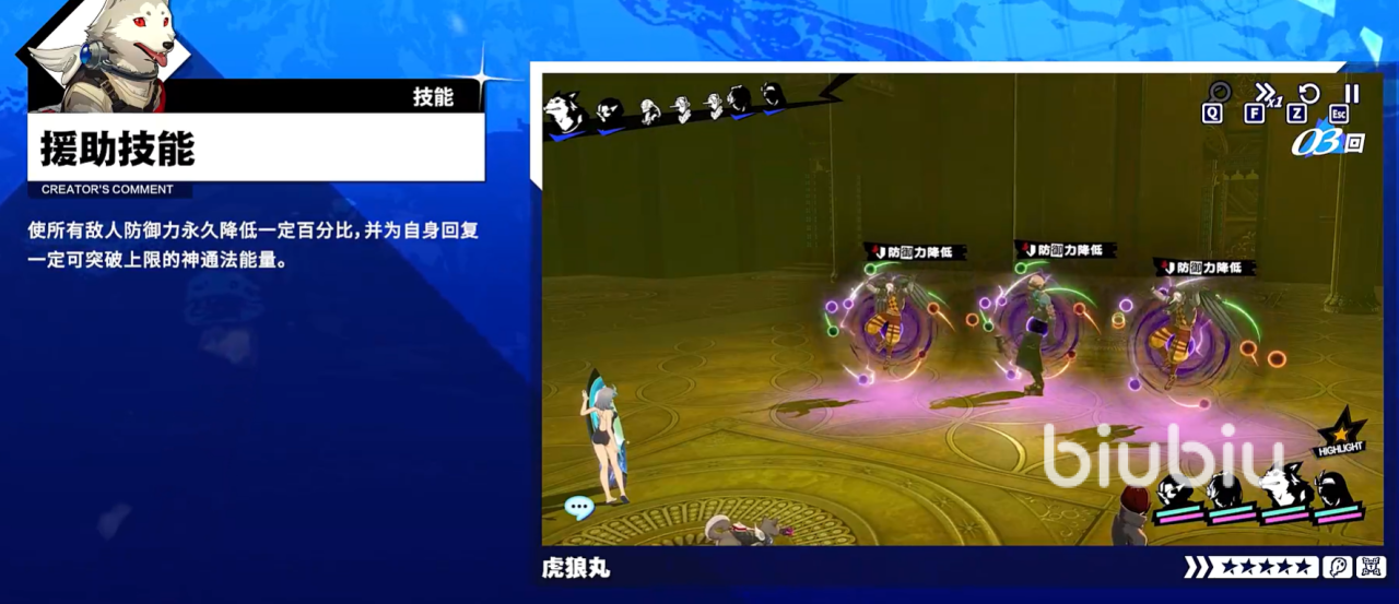 战斗开始前,玩家需手动选定一名同伴作为“饲主”,该操作不可跳过。完成指定后,虎狼丸将立即释放基础援助技能,并进入跟随状态。若饲主为S.E.E.S.所属成员,饲主可在自身援助技能栏中主动调用虎狼丸技能,且不影响自身原有援助指令使用,实质上拓展了单回合内的战术响应维度;若饲主非S.E.E.S.成员,则虎狼丸将在饲主回合起始时,依据其属性自动匹配对应技能释放逻辑,整体更偏向智能协同模式。值得注意的是,尽管虎狼丸无独立行动权,但所有设计在饲主回合开始与结束时触发的效果均正常生效,不存在机制断层或资源浪费问题。