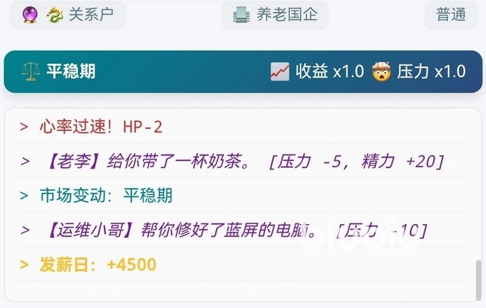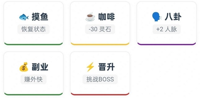 在玩法设计上,《大厂修仙传-打工人飞升模拟器》重构了传统修仙数值模型:灵石对应薪资收入,发量直接关联角色生命值,人脉关系转化为因果修为,压力值影响道心稳定性,进而导致血量流失;工作时长越久,精力消耗越快,需通过冥想、炼丹或购置法器等方式恢复状态。