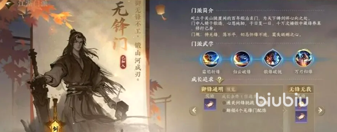 技能配置上,无锋门引入两个全新百家技能:霜焰斩锋与归云破锋。前者为PVE核心输出技,支持移动施放,具备多段斩击判定与怪物伤害加成,习得门槛为达成“初入无锋”境界;后者专精PVP对抗,可突进至目标后方施加“破盾”与“破绽标记”,配合普攻强化技“问锋斩”或群侠/绝技引爆,形成高节奏连招链。