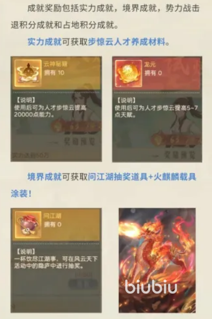 奖励体系分为成就奖励与排行榜奖励两大模块。成就类奖励包括:实力成就(步惊云养成材料)、境界成就(问江湖抽奖道具、火麒麟载具涂装)、势力战击退积分成就与占地积分成就(均含抽奖道具及养成材料)。其中,问江湖抽奖道具可在隐庐中抽取风云限定内容,涵盖风云卡提升道具、稀有人才、主题服装等。排行榜奖励方面:境界榜依据境界等级与实力值综合排序,发放专属技能道具、风云天下头像框、风云合璧主角时装;势力战个人榜按总战绩积分排名,首奖为步惊云专属人才信物;势力战势力榜以全势力总积分决出名次,同势力所有成员均可共享步惊云养成材料分红。