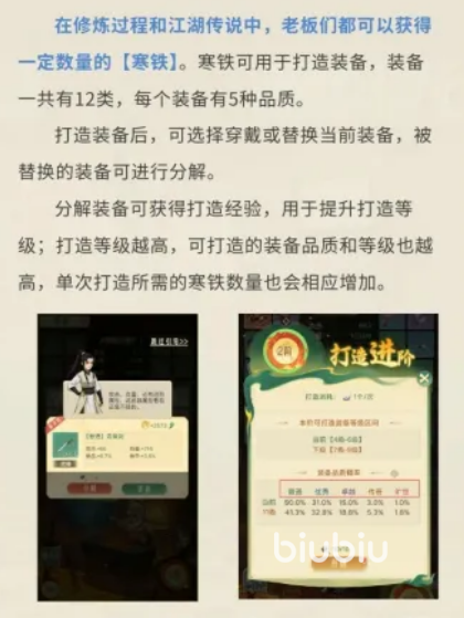 装备系统围绕寒铁展开,支持12类装备、每类含5档品质(白→绿→蓝→紫→橙),品质越高,基础属性加成越强。打造等级决定可合成装备的最高品质上限,等级提升需消耗寒铁,且随等级升高,所需寒铁量线性增长。装备分解可返还打造经验,用于升级打造等级。每件装备具备基础属性与进阶属性,合理搭配可构建特色流派;当前版本推荐“闪避+抗暴”组合,兼顾生存韧性与输出稳定性。装备配套功法后,可激活怒气技能,在战斗类事件中发挥战术作用。