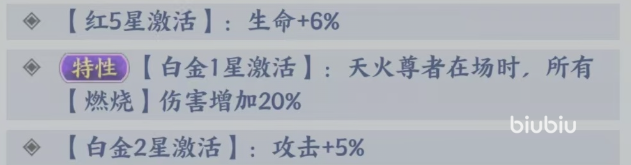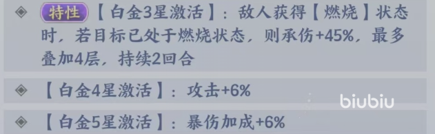 角色成长路径上,升星带来的特性升级尤为关键。当升至红四星时,普攻可触发60%概率附加燃烧效果;进阶至白金一星后,所有燃烧伤害提升20%,进一步强化其灼烧流派的专精度;至白金三星阶段,机制再次跃升——每当敌方单位处于燃烧状态时,天火尊者对其造成的伤害将额外提升45%承伤系数,且该效果可叠加至四层,大幅提升整体输出转化效率。由此可知,该角色天然契合纯火系灼烧体系,不推荐混搭其他元素流派。