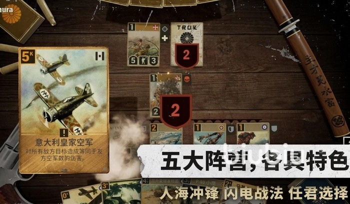 游戏采用双阵营构筑机制:玩家需选定一个主国家,并从其余参战国中选择一个盟国,共同组建一套共40张卡牌的对战套牌。核心策略围绕资源管理展开——每回合自动获得指挥点数(Command Points),用于部署单位卡、发动指令卡或激活支援效果。