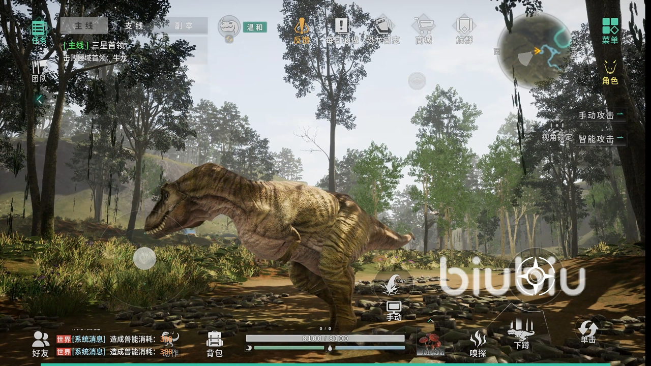 游戏中已实装多类标志性恐龙角色,包括牛龙、霸王龙、三角龙及迅猛龙等,每种生物均拥有独立建模、差异化生理机制与专属技能体系。例如霸王龙侧重力量压制与范围震慑,迅猛龙强调机动协同与群体突袭,三角龙则突出防御反制与地形卡位能力——不同选择将导向截然不同的生存策略路径。