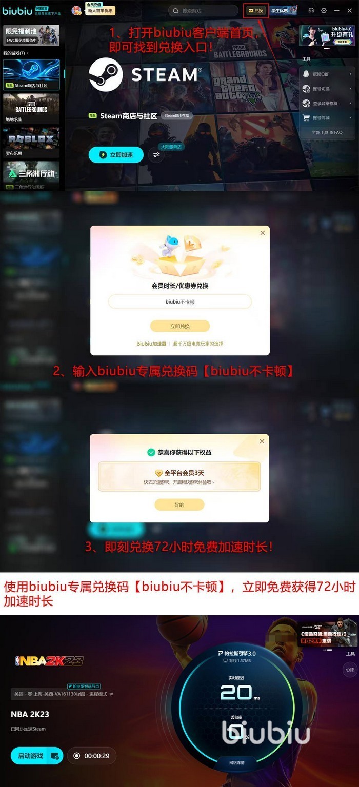 biubiu加速器深耕游戏网络优化领域多年,由阿里巴巴灵犀互娱旗下九游、交易猫、biubiu加速器三大产品线协同技术支撑,构建专属电竞级传输通道。其最新3.0版本搭载自研帕拉斯引擎,在延迟控制、协议适配与节点调度方面完成深度升级。为保障实际体验,官方特邀《绝地求生》全球赛事冠军左梓轩担任产品体验官,全程参与多场景压力测试与参数调优。针对新老用户,平台开放限时福利:输入口令“biubiu不卡顿”,即可兑换3天全平台高级会员权限;新用户注册即赠24小时体验时长,两项权益可叠加使用,总计可达96小时免费服务。