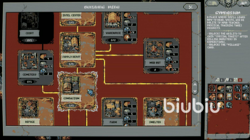 战斗过程中掉落的战利品包括基础装备、技能书、稀有遗物及特殊材料。其中,部分装备具备词条叠加与套装效果,技能书可永久解锁主动/被动能力,而材料则全部用于幸存者营地建设。营地系统是长线成长的核心枢纽:升级“铁匠铺”提升装备品质上限,扩建“图书馆”解锁高级卡牌,强化“祭坛”则影响守护神契约效果。每一次循环积累的资源,都会转化为下一轮更稳固的起点。