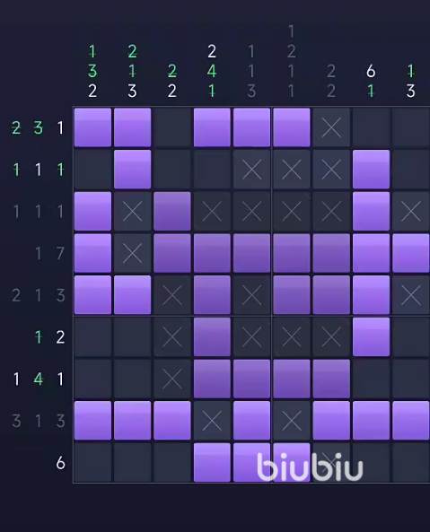 “数涂”采用低饱和度配色与极简UI设计,长时间操作不易产生视觉疲劳。游戏以数字线索为引导,帮助玩家构建推理路径,逐步锁定唯一解。完成正确涂格即获得积分并推进关卡进度,操作直观且反馈清晰。