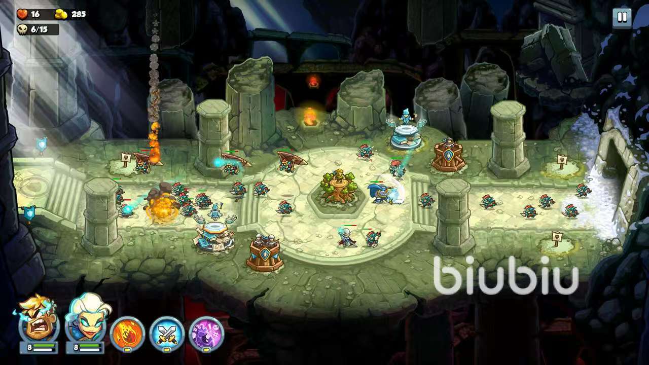 在玩法体系层面,本作实现系统性升级:首次引入“双英雄协同作战”机制,两位英雄可同步参战并触发专属联动效果;防御塔、英雄、法术三大养成模块完全独立,各自拥有专属强化路径与加点自由度,支持爆发型、控制型、辅助型等多元流派构建。游戏共提供15座风格迥异的防御塔,以及27个可逐级进化的单位(含小兵与特殊单位),战术组合维度显著拓宽。