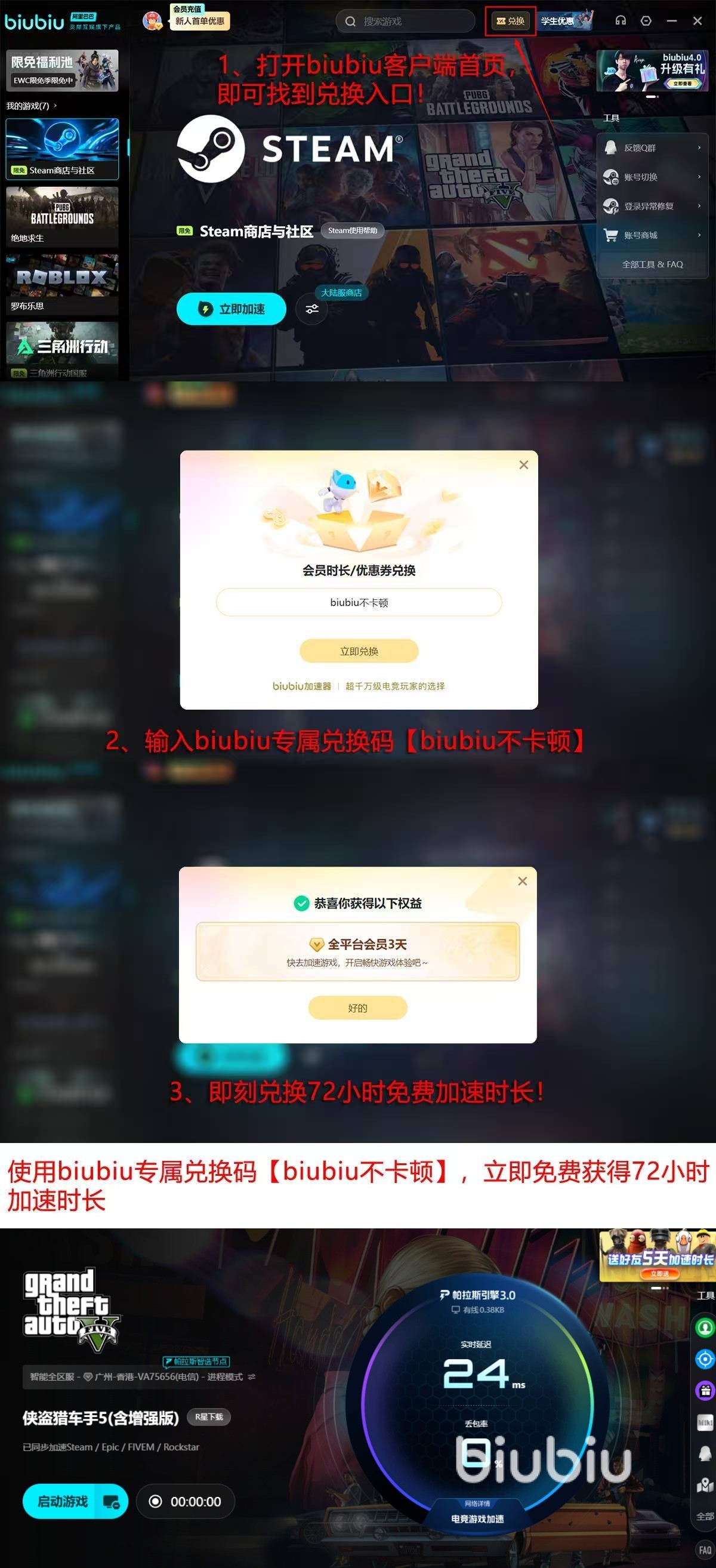 除了拥有良好的加速效果外,这加速器本身还拥有不错的福利内容,拥有【biubiu不卡顿】兑换码兑换72使用时长的福利内容和新用户注册免费领取24小时体验时间这两项福利,累计可以领取到96小时的免费使用时间,白嫖的时间也是相当之长了比起其他加速器来说可以让用户免费体验更久,另外加速器内还拥有海量游戏,可以说只要是现在市面上的热门游戏,那都可以在加速器中找到并且进行加速,这就意味着只要玩家有游戏方面的需求的话,都是可以使用该加速去解决的,所以综合看下来有这么多优点的加速器没有理由不去推荐。