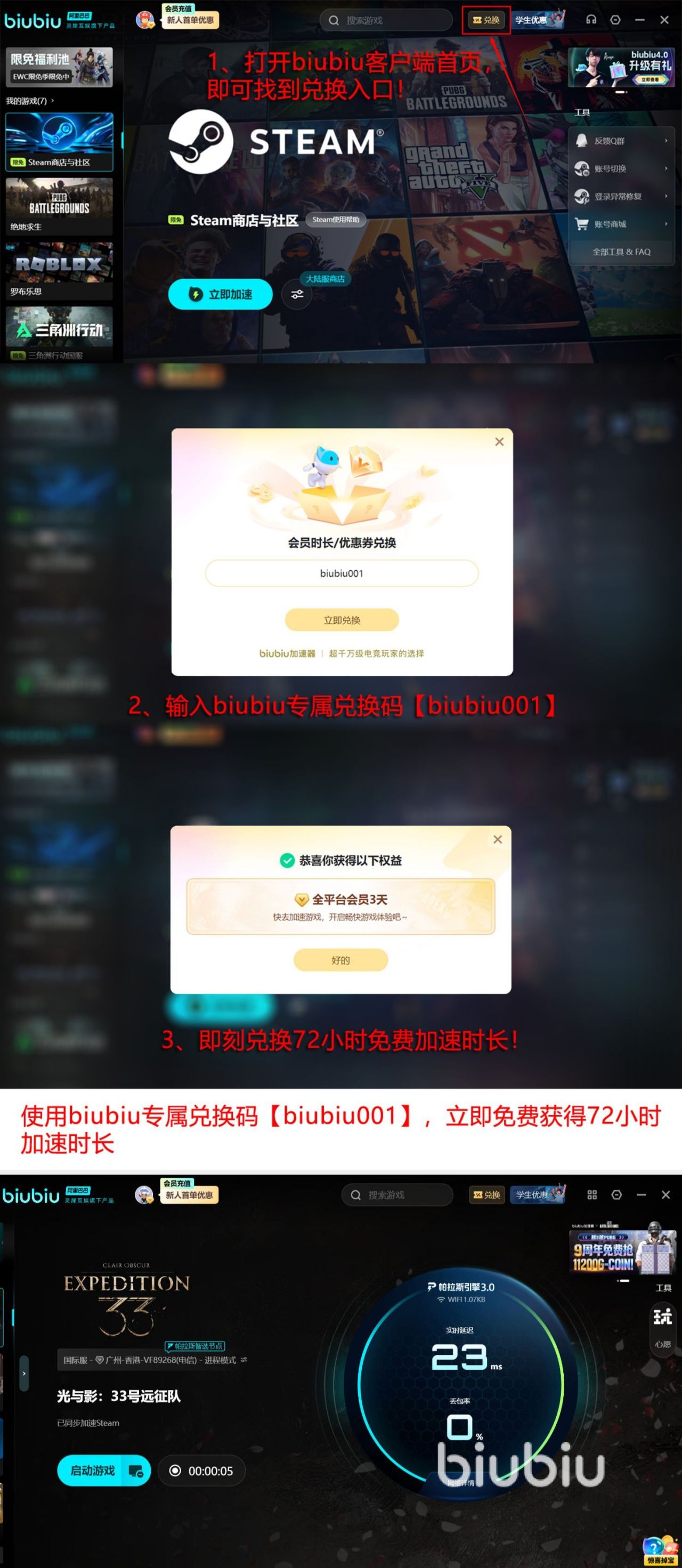 在使用加速器时,玩家也可以免费领取福利,所有的玩家都可以享受到。对新用户而言,最高就可以免费长达96小时,有一个24小时的新人福利,另外还可以使用【biubiu001】获取3天的免费加速时长,对于新用户而言,在获取这免费加速时长之后,那随时都可以享受稳定的网络,再也不需要因为卡顿或者是闪退而操心。