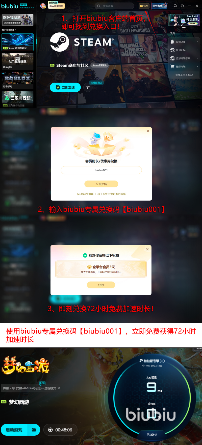 现在加速器还给所有的玩家去准备免费的福利,新老用户全部都可以享受到。【biubiu001】这是一个通用兑换码,每一个用户都可以申请,可以获取3天的免费加速时长。当然对于新用户而言,还会有一个额外的惊喜,在首次注册之后,还能获得24小时的新手礼包。别以为只能单独使用,可以把两个方法放在一起,那免费的时长就可以达到96小时,可以让大家尽情的完成副本或者是抓鬼。
