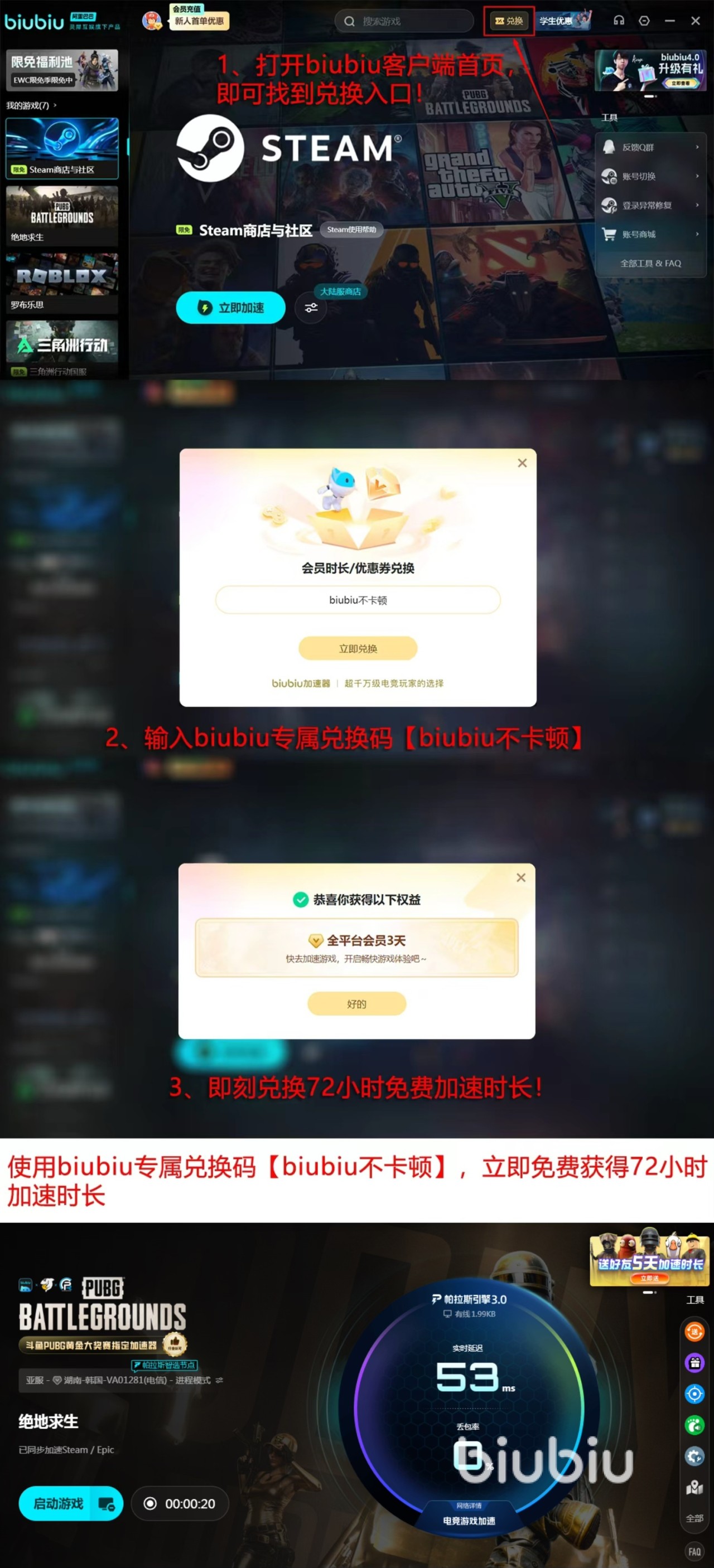 当然,说得再好也不如自己上手试一试,对于还没用过的新朋友,biubiu这边很实在,新人注册成功并登录,账号内就能拥有24小时的免费加速时长,让你能先亲身体验一下效果。而且平台还准备了一项福利,不管新老用户,都能用兑换码【biubiu不卡顿】换来额外的3天加速时长。