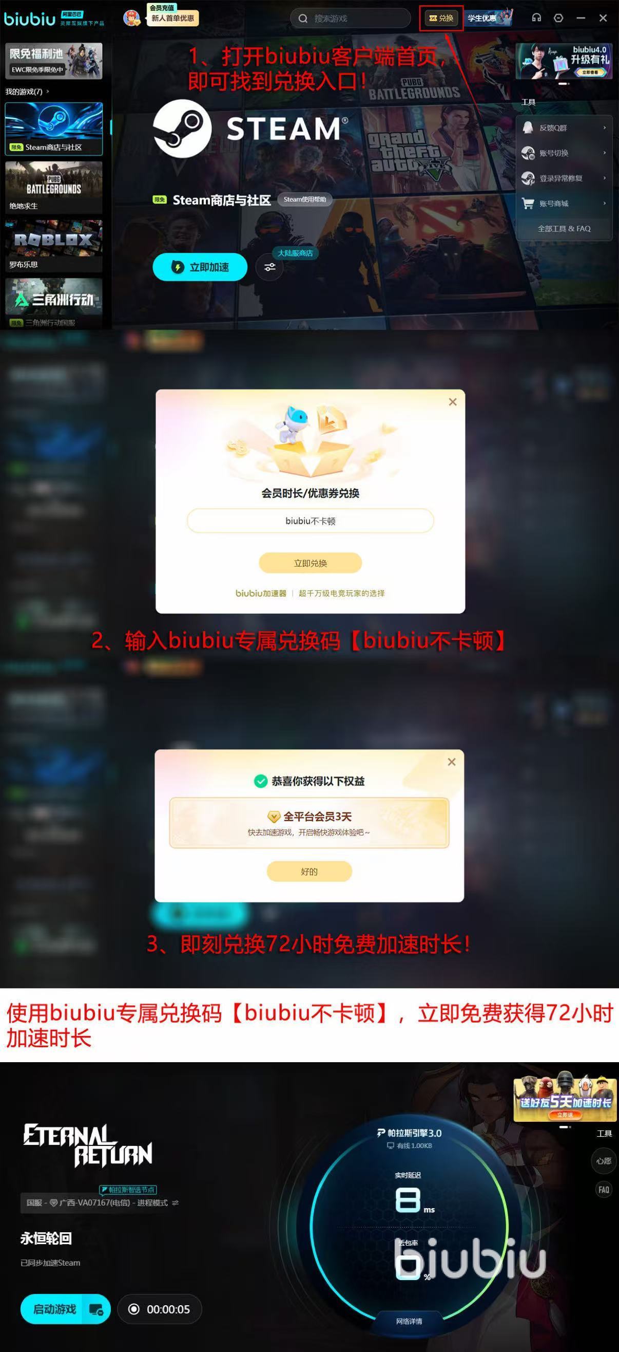为了降低大家的试错成本,biubiu还带来大量免费试用活动,比如新用户注册就能享受24H全功能加速,首充价格更是低至一杯奶茶钱。现在还有福利口令码【biubiu不卡顿】赠送3天免费加速,新老用户同享福利,新用户领取后最多享受96H的免费加速,足够大家玩到爽了。