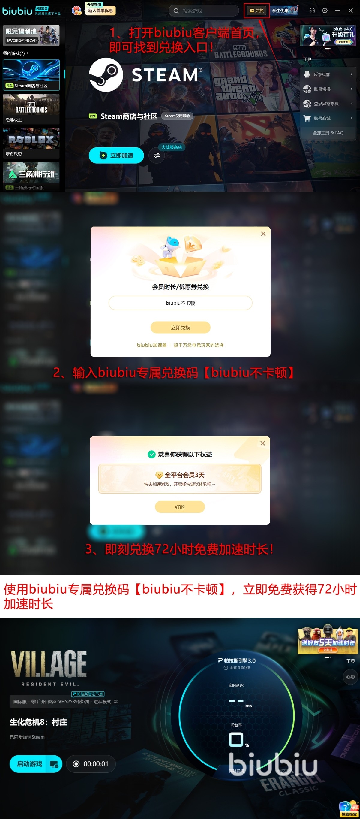 那么关于生化危机8崩溃怎么办的解决办法就介绍到这里了。趁现在biubiu还有福利时长相送,把网络理顺,等下次重温村庄噩梦时,就不用怕被报错窗口打断。