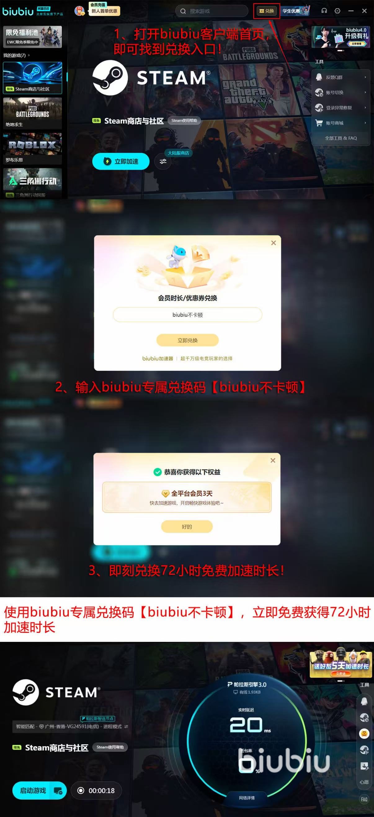 性价比高也是biubiu的优势,新用户免费加速24小时的活动长期有效,还有福利口令【biubiu不卡顿】向所有用户赠送3天免费加速,新用户领取口令后最高享受96H的限免时长,对学生党和休闲玩家们特别友好,既给大家省了钱,又有足够长的限免时间让大家好好体验。