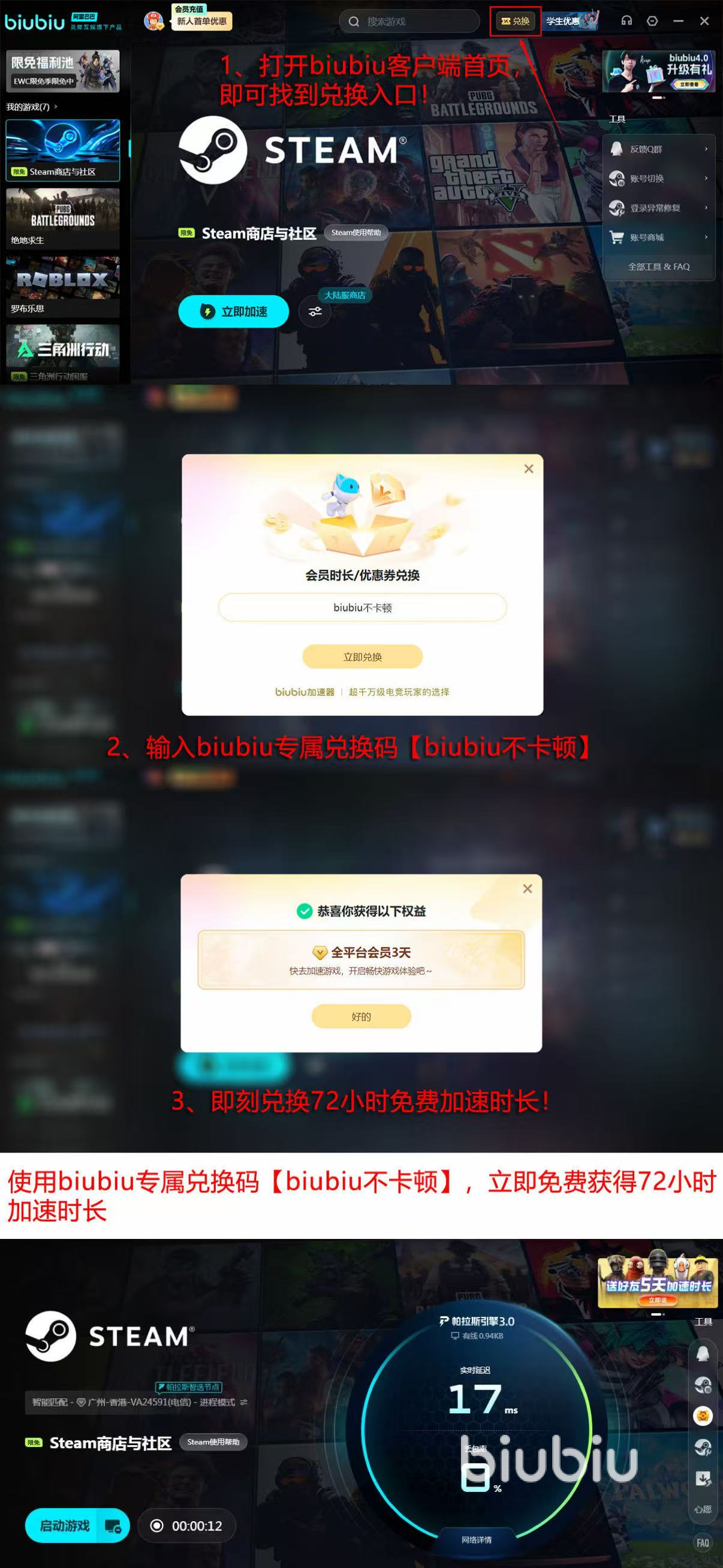 它的免费福利也是非常多的,新用户享受24H免费加速时长,不强制订阅、续费,试用满意再自主购买正式会员。还有口令【biubiu不卡顿】给全平台用户赠送3天免费加速,诚意真的是很足了。宝子们还可以关注限免游戏池,里面有很多国服游戏开放限免加速,真正做到打开即用,无任何隐形消费。