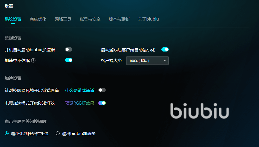 软件界面设计简约又大气,各种功能操作十分便捷,不用调整参数、设置节点这些复杂的操作,只要找出游戏一键急加速就可以。为了方便大家使用,它还有很多人性化设置,例如在游戏启动以后软件会最小化到后台持续加速,将电脑桌面腾出来给玩家操作游戏。还有电脑开机自动启动biubiu,这个设置特别适合那些游戏迷们,连自己打开软件的步骤都省掉了。