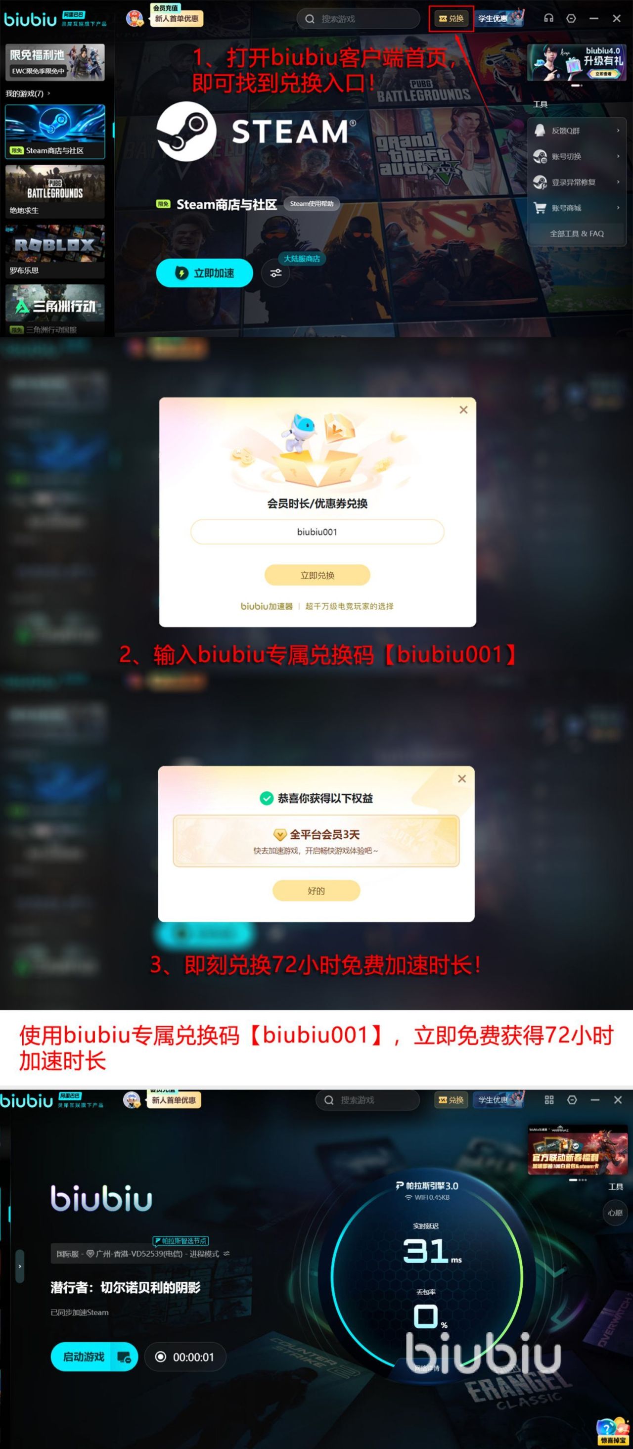全程开启biubiu加速器后,可显著降低因网络抖动引发的掉线与闪退概率。该产品由阿里巴巴灵犀互娱研发,与九游、交易猫同属其旗下核心工具类产品矩阵。新用户注册即可领取24小时免费加速时长;输入专属兑换码【biubiu001】还可额外获得三天加速权益。两项福利叠加使用,新手玩家最高可享96个小时无限制加速服务。