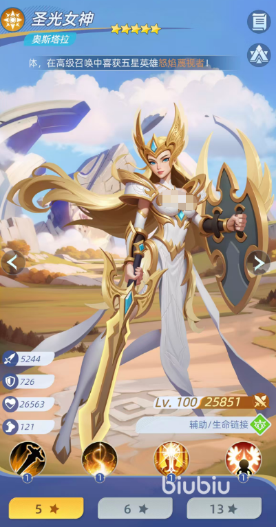 圣光女神定位为团队级辅助角色。其标志性技能「生命链接」可锁定当前生命值最低的友方单位,建立灵魂联结,并将治疗效果同步覆盖至所有处于链接范围内的队友。单次治疗量等同于自身攻击力的156%,并附加10%常驻免伤。该免伤效果可叠加至5层,满层时提供50%高额减伤,显著提升整支神魔队在高压环境下的容错率与持久作战能力。