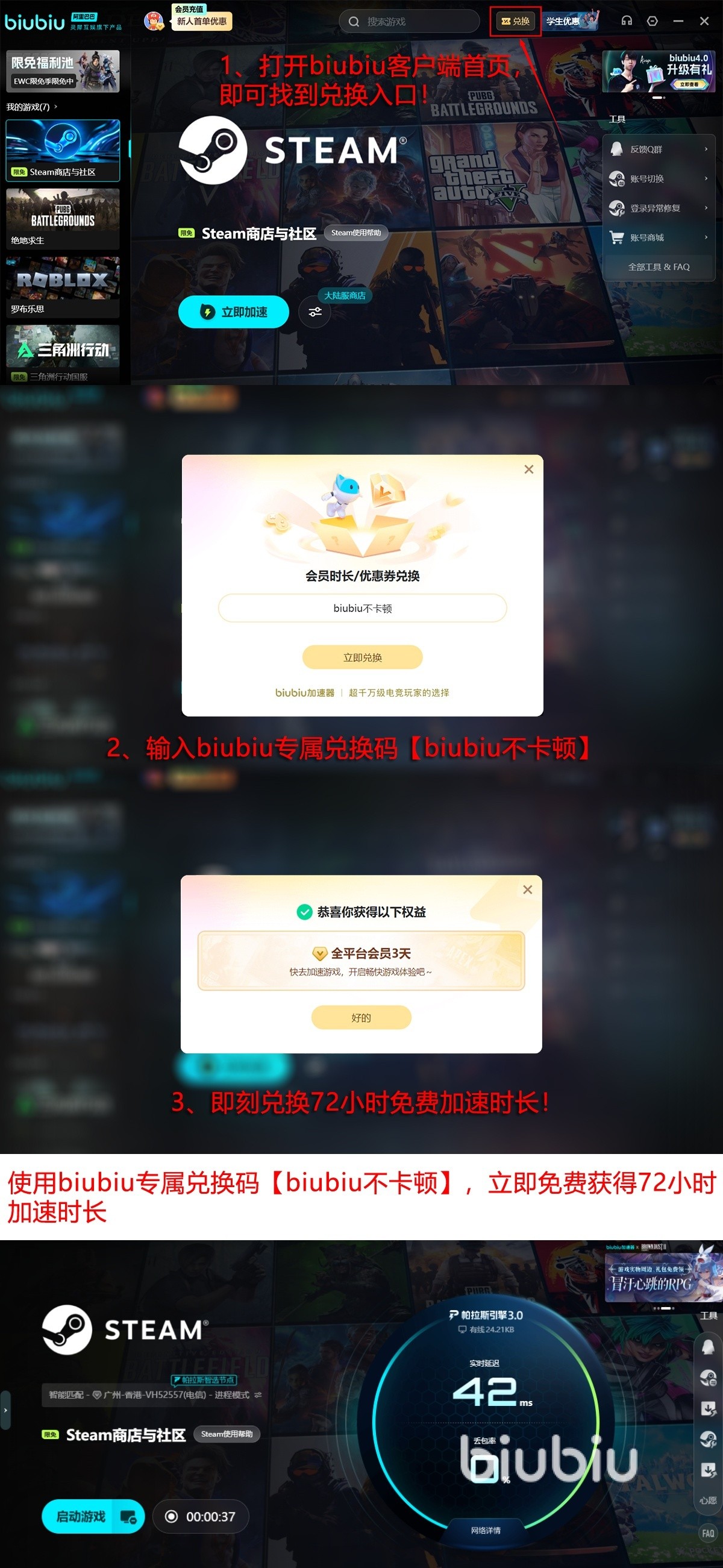 biubiu加速器由阿里巴巴灵犀互娱技术团队研发,与九游、交易猫同属该体系下的核心游戏服务产品。平台支持超20000款主流游戏一键加速,涵盖《原神》《崩坏:星穹铁道》《无畏契约》《英雄联盟手游》等全类型作品。更新机制高度敏捷——每款游戏大版本上线后48小时内即完成专项适配,确保帧率稳定性与加载效率双重提升。新用户注册即可获赠24小时免费加速时长;输入兑换码【biubiu不卡顿】还可额外领取72小时,累计达96小时深度体验周期,便于全面评估实际优化效果。