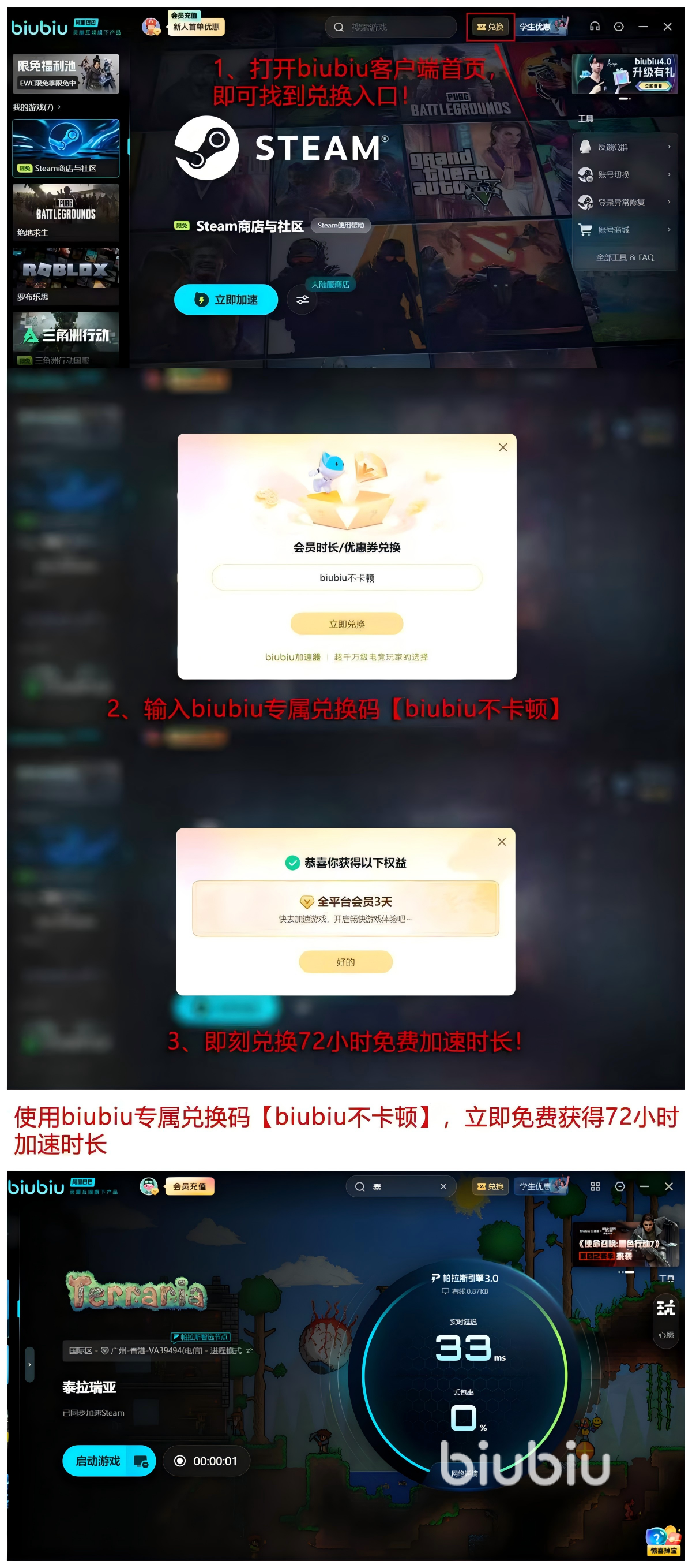 输入口令【biubiu不卡顿】即可领取72小时极速加速权益;新用户注册还可叠加24小时专属福利,总计享96小时免费加速时长。该权益支持后台常驻运行,全程无感调度,已获大量《泰拉瑞亚》玩家实测认可。