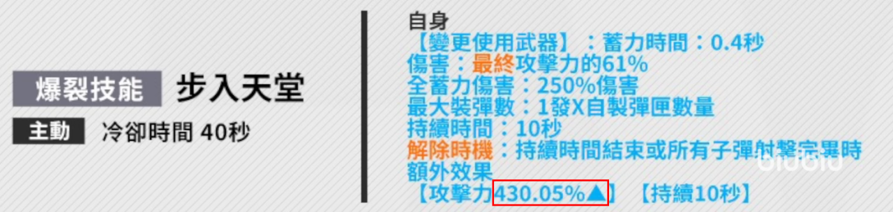 真正的高光时刻是爆裂技能"进入天堂",开启后E.H.会切换武器将弹仓内的所有“自制弹匣”转化为子弹进行一次性发射,每发子弹都拥有高达430%的攻击力倍率且享受满蓄力伤害加成。也就是说叠满4层弹仓开启爆裂时,能够打出毁天灭地的瞬发伤害,因此E.H.的强度非常依赖于能够快速破坏部件或者拥有大量可破坏物体的boss环境。只要放在合适的战场中,她的爆发力足以改变战局。