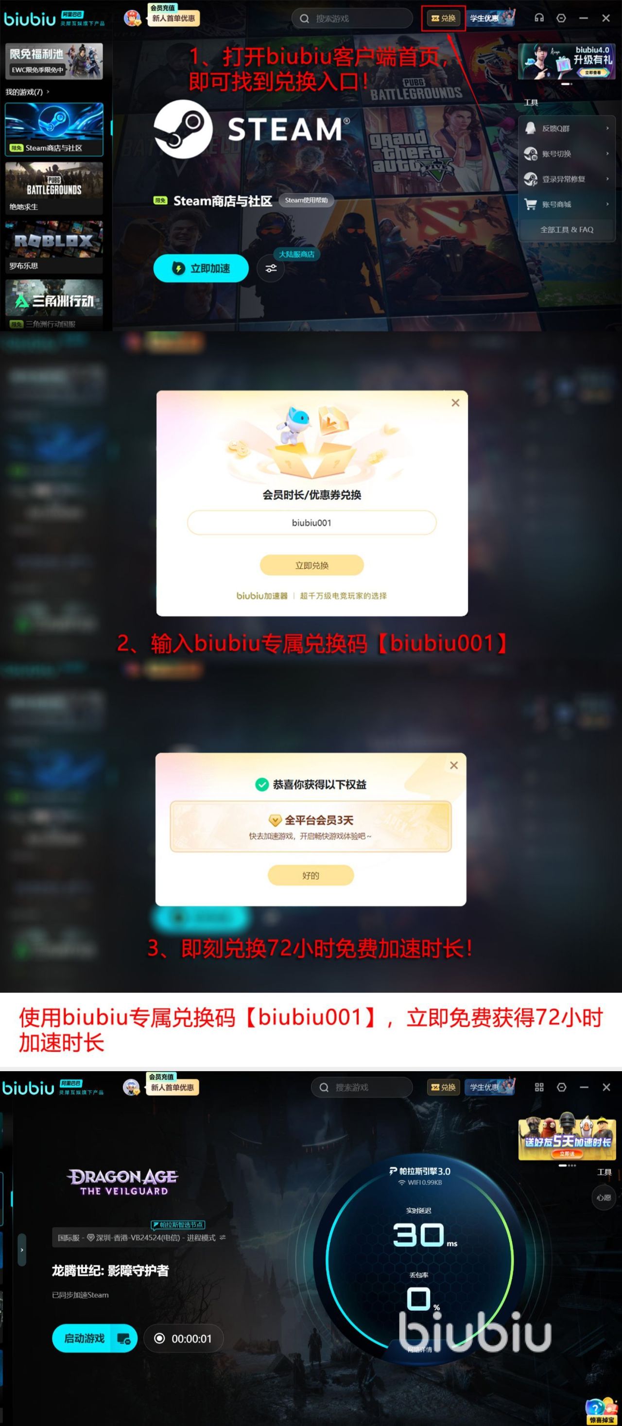 当前平台开放限时福利活动:输入兑换码【biubiu001】即可领取72小时免费加速时长;新注册用户额外获赠24小时专属权益,总计可享96小时无门槛加速服务。