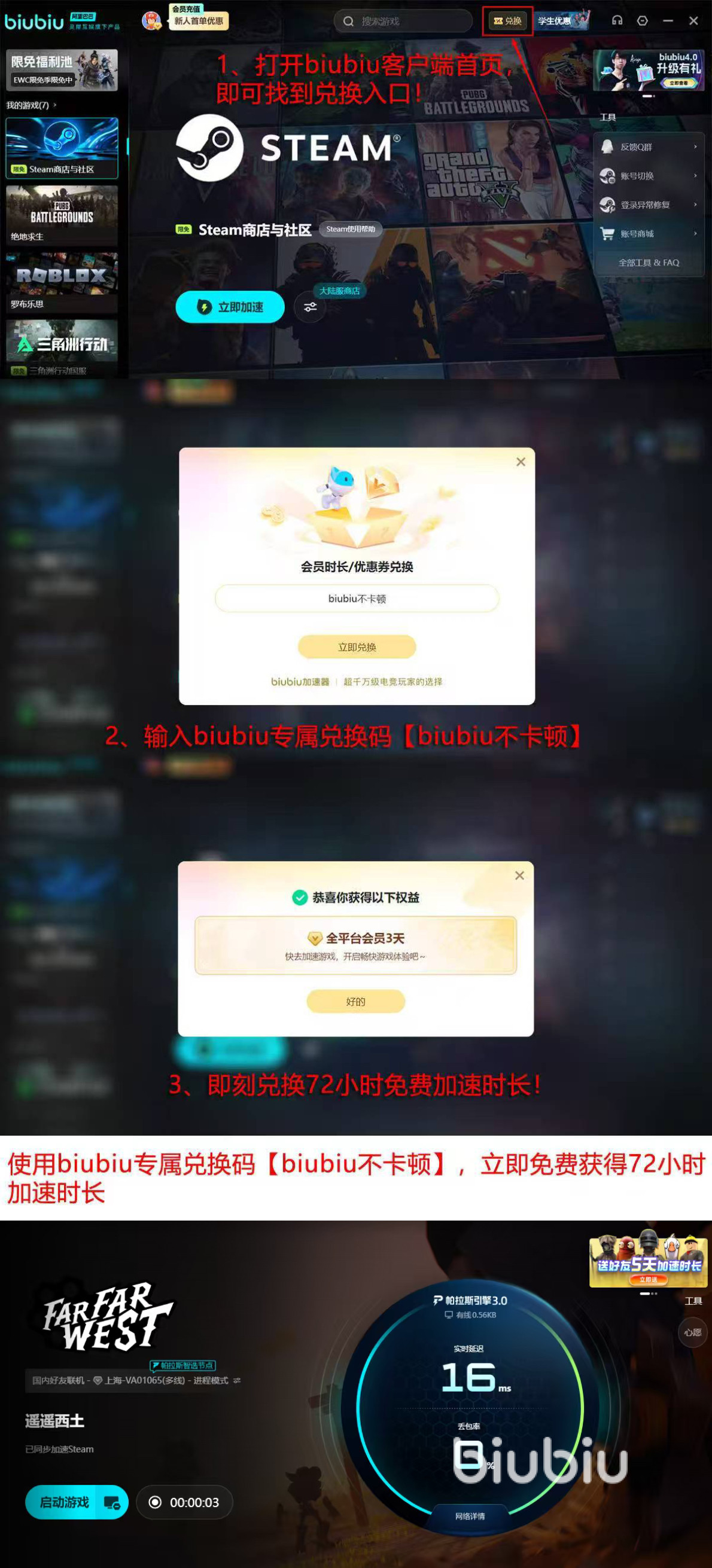对首次使用的用户,biubiu提供无门槛试用机制:完成注册后即赠24小时全功能免费加速权限;叠加输入兑换码【biubiu不卡顿】,还可额外激活72小时服务,累计达96小时。该时长足以覆盖遥遥西土完整客户端下载及首轮大型更新。安装流程简洁,界面操作直观,无需修改系统设置或配置代理参数,全程“一键加速”,零技术基础也可快速上手。
