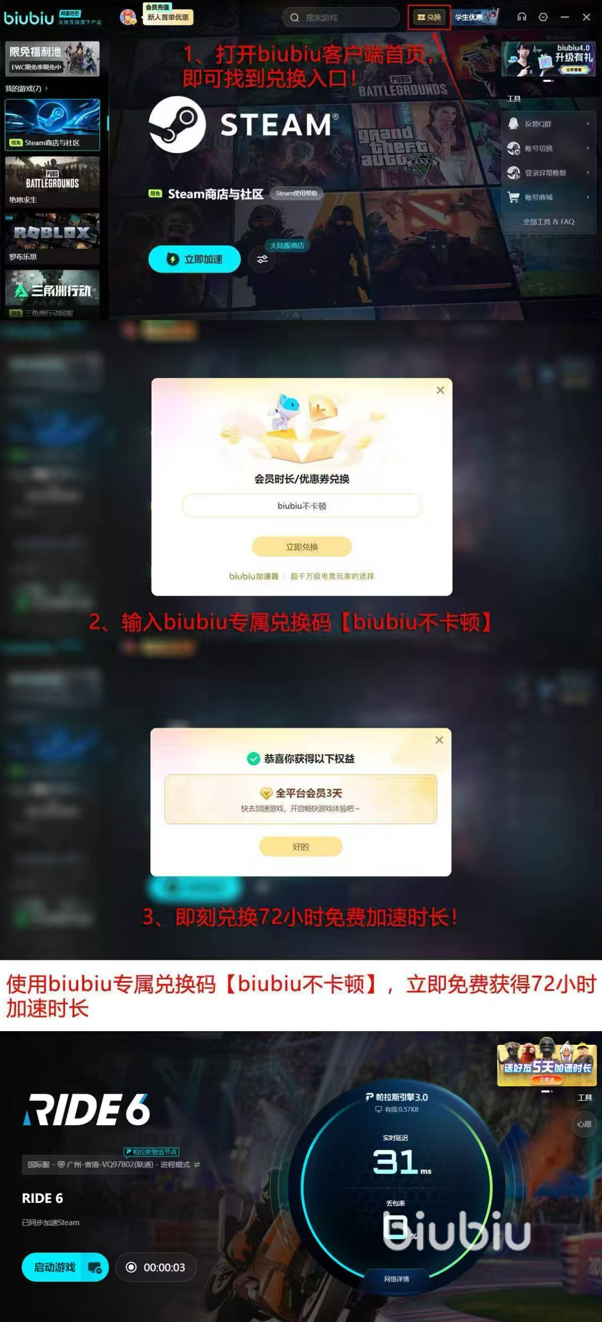 值得一提的是,biubiu加速器还是XDD小叮当代言的,作为PUBG冠军选手,小叮当自己也在用这款加速器,足以看出它的实力。它搭载了独立自研的帕拉斯3.0引擎,加速性能拉满,稳定性远超同类产品。新人首次注册就能直接领取24小时免费加速,输入兑换码【biubiu不卡顿】还能额外领到72小时免费时长,加起来一共96小时,相当于4天免费体验,完全可以好好感受一下它的加速效果。