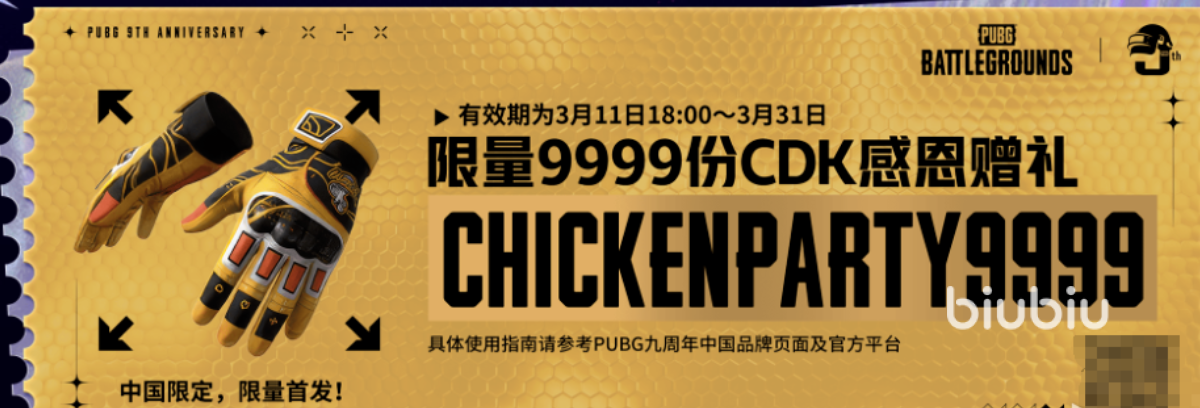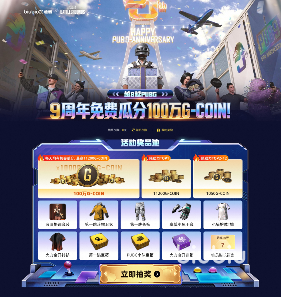 更令人惊喜的是,在3月11日至4月5日之间,biubiu对pubg九周年进行了大手笔的福利活动,100万G-COIN等你来瓜分,玩家每天都有机会参加抽奖,单人最高可获得11200G-COIN。另外还有浪漫格调套装、第一跳连帽卫衣、第一跳长裤、赛博小兔手套等实物和虚拟奖品等你来抽。