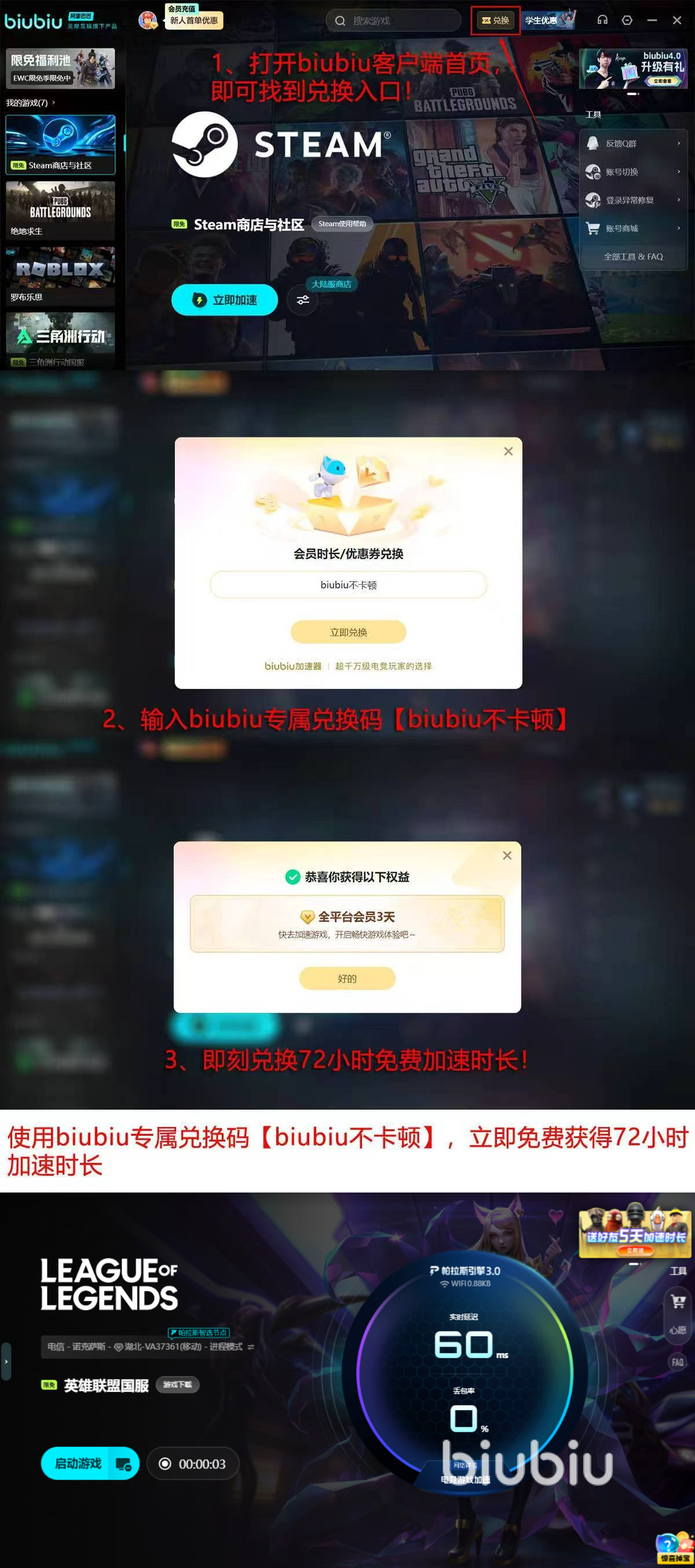 新玩家注册24小时内可以免费使用全部功能,输入【biubiu不卡顿】,即可获得额外72小时加速时间。双倍福利叠加,新用户可以获得总共96个小时的高质量加速服务,彻底解决lol客户端卡顿问题,在召唤师峡谷里尽情展现自己的竞技实力。