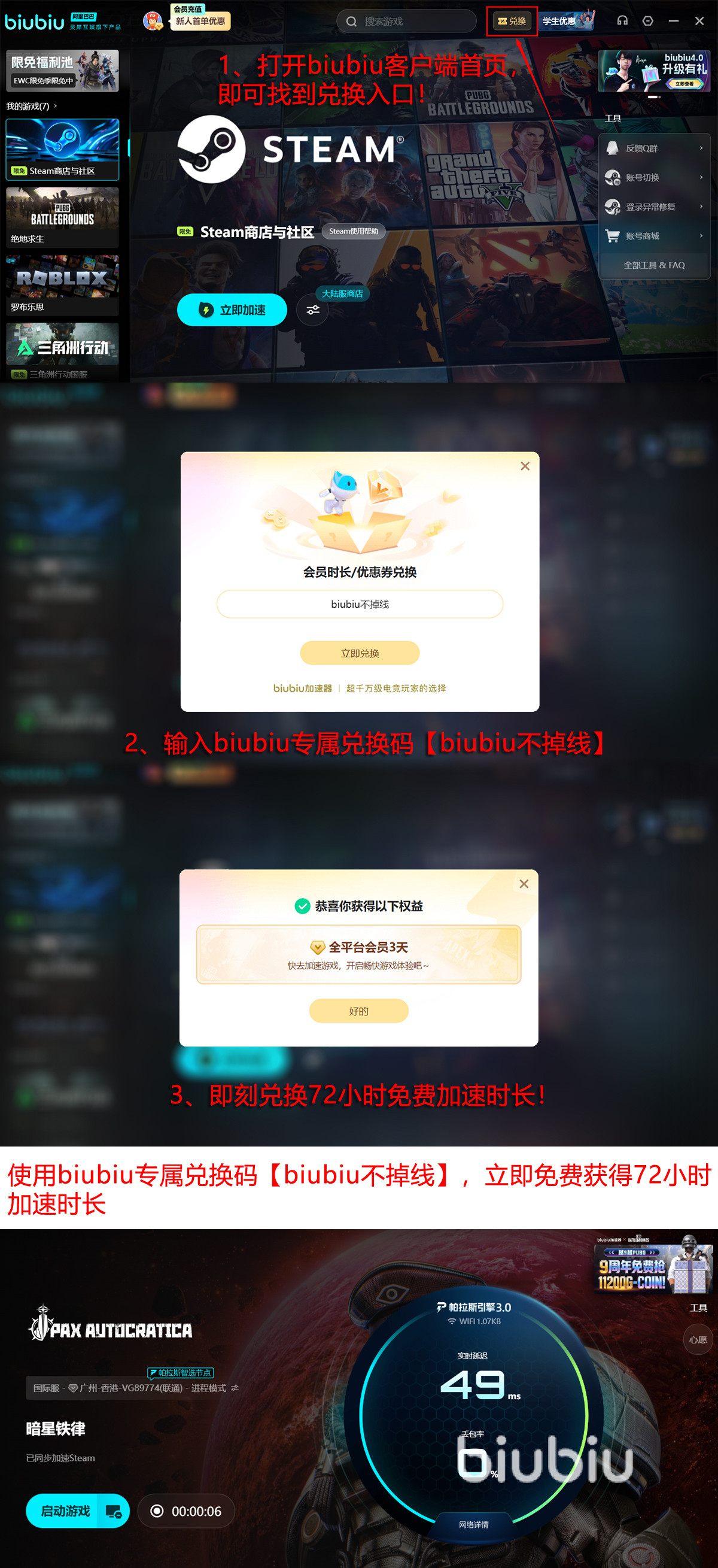 对于初入暗星铁律战场的新玩家,biubiu准备了非常有诚意的入门福利,成功注册后,立即激活首日24小时全功能免费试用权限,输入【biubiu不掉线】可以再额外领取72小时的免费加速时长,两重福利叠加,新用户可以享受96小时顶级加速体验。