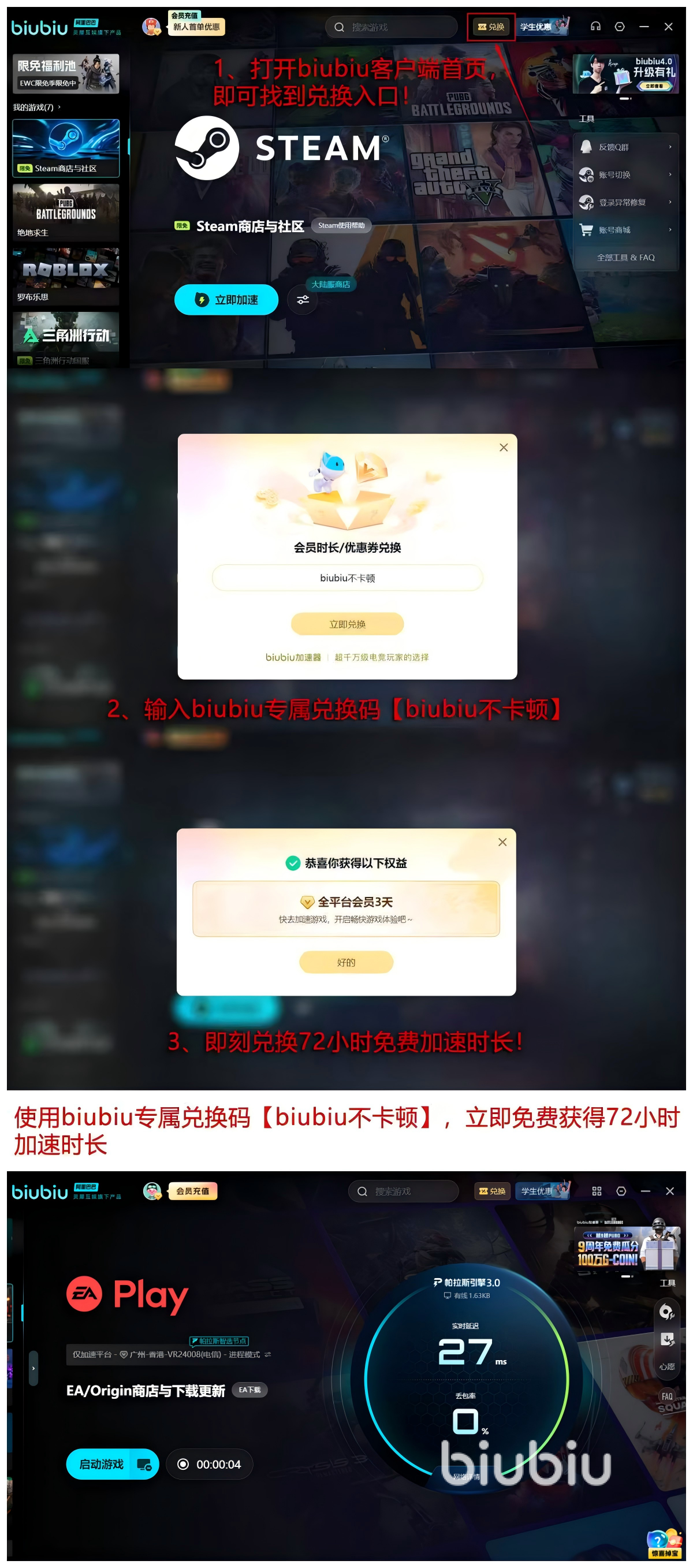比如说针对各位没使用过的用户,推出了【biubiu不卡顿】口令能够领取72小时的时间,并且可以叠加新人获取的加速福利24小时,换算一下总计能够获得96小时的加速时间,在时间上已经是非常的多的体验时间了,保证各位运行的效率足够的长的同时各位还能获取超级体贴的服务,运行的效果也是不言而喻的好。