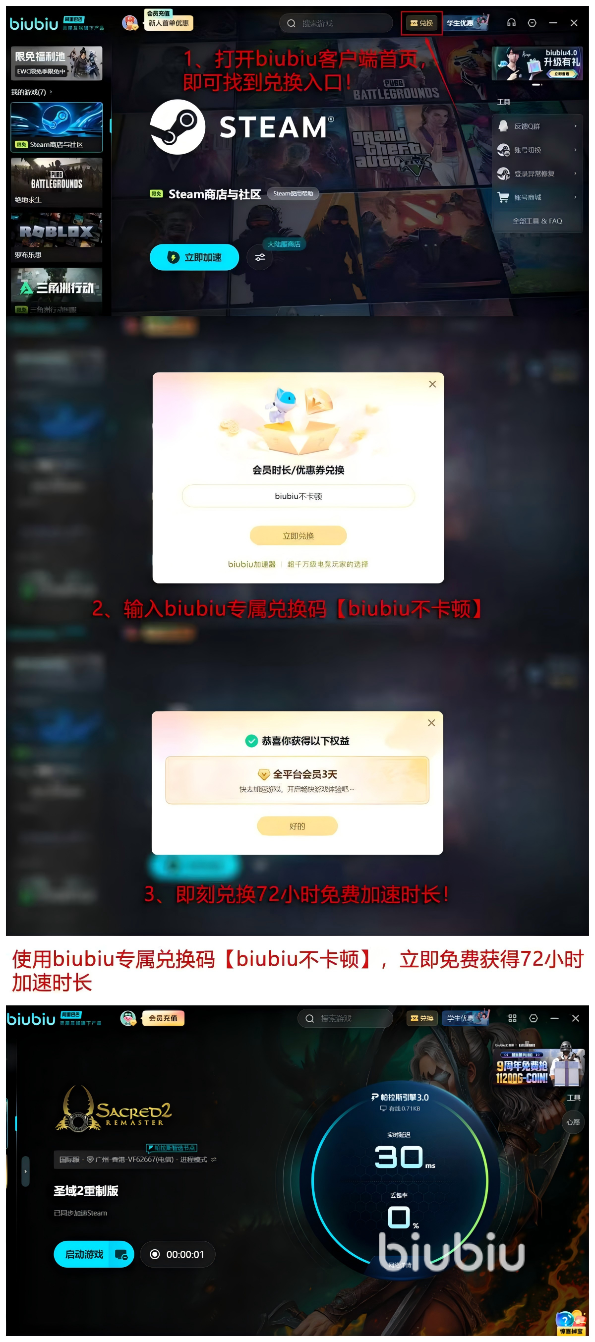 推荐各位使用【biubiu不卡顿】口令,能够兑换非常有用的72小时,并且累计增加新人的加速福利24小时,大家总计能够获得96h的官方赠予时间,这是非常难得的一个活动,不但良心大家的选择性又大,能够随时使用不用担心后续的其他问题。